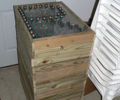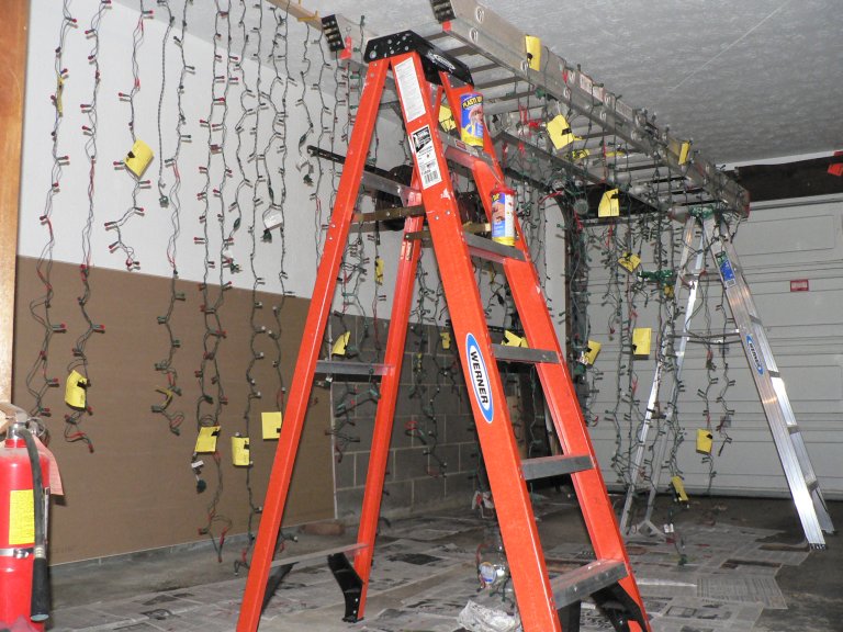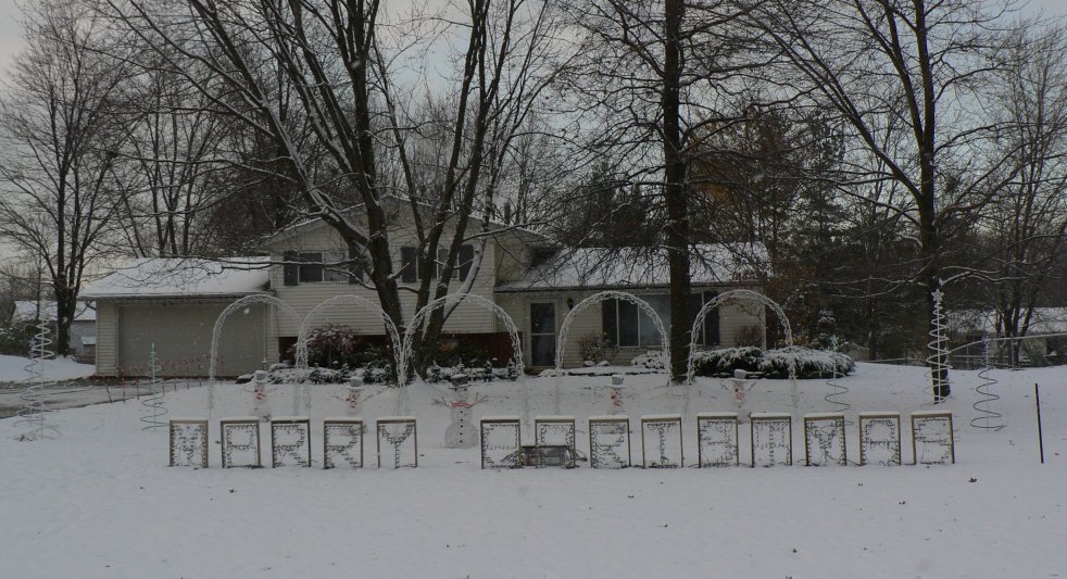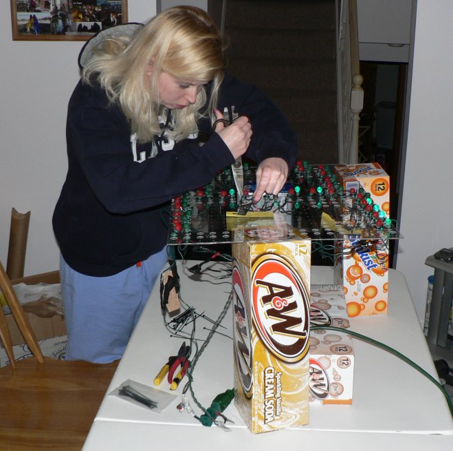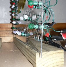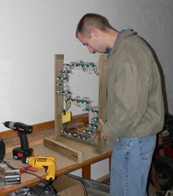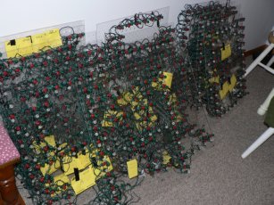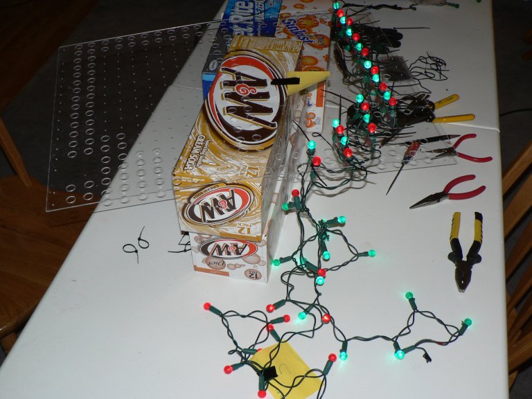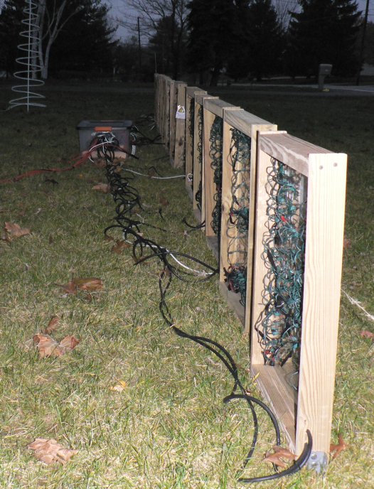 LED lights were used to create a custom letter display for 2007. There are 41 letters in all mounted on 14 different 18x24 inch pieces of plexiglass. We made these ourselves as the photos below show. It is capable of displaying Merry Christmas in red or green and Happy Holidays in white.