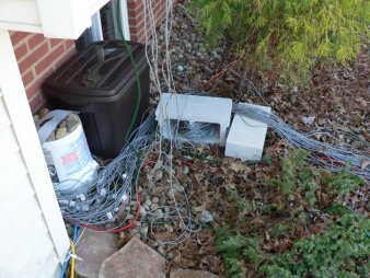 Control boxes hanging from the gutters for the icicle lights.